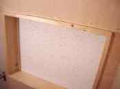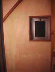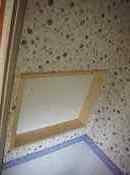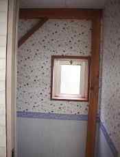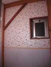 | 接着剤は、紙用のノリに木工用ボンドを混ぜると、業務用のノリと同じくらい接着力が増すと プロの職人さんが言っていた。 さて壁紙だが、上が花柄 下が縦ラインのグレー 帯が濃い目の花柄紫 (妻の好み) 施行上、柱を出したままの方が楽だったので そうしたのだが、壁紙を貼るまでちょっと心配だった 壁紙を貼ってみたら、逆に柱がアクセントになってかなりいい感じである。 ただ、室内の棚はやはりクリアニスではなく、柱と同じ様な色を塗るべきであった |