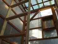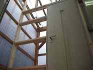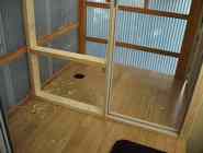 リサイクルショップでトイレに合うドアを 探しに行き、たまたまモデルハウスで 使っていたトイレ用ドアを見つけ購入! その枠を基準に、骨を入れていく。 写真では見えないが、骨のつなぎ目は 全てノミで等で削り、はめ込んでから ネジ止めしているのでかなり頑丈! 私が乗ってもびくともしない。 |